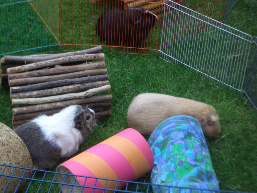 There was a big black cloud just hidden behind the trees although I think she could see it because she was watching which way it was moving. She watched it till it made a very loud noise. Then it started pouring with rain and she had to rush to get us in. I couldn’t decide which of the tents and tunnels to get in but Victor got in the pop-up tunnel and Mummy held him in that so I went for the big tent which had fallen sideways. Then she got Hec in his snuggletunnel and Humphrey who was nice and calmly sitting in his tent. Then she got the soft furnishings in and closed the door. She left the cage tops out because it was raining very loudly.