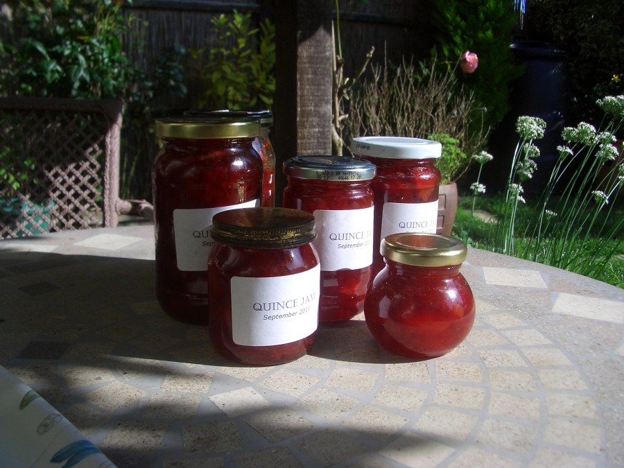 I’d never had quince until I visited you boys and Mummy. We had jam for breakfast, and she sent us home with a jar of it! Mmm. At home, I really enjoyed it on my rice cakes — it was a nice reminder of my visit to Norfolk.