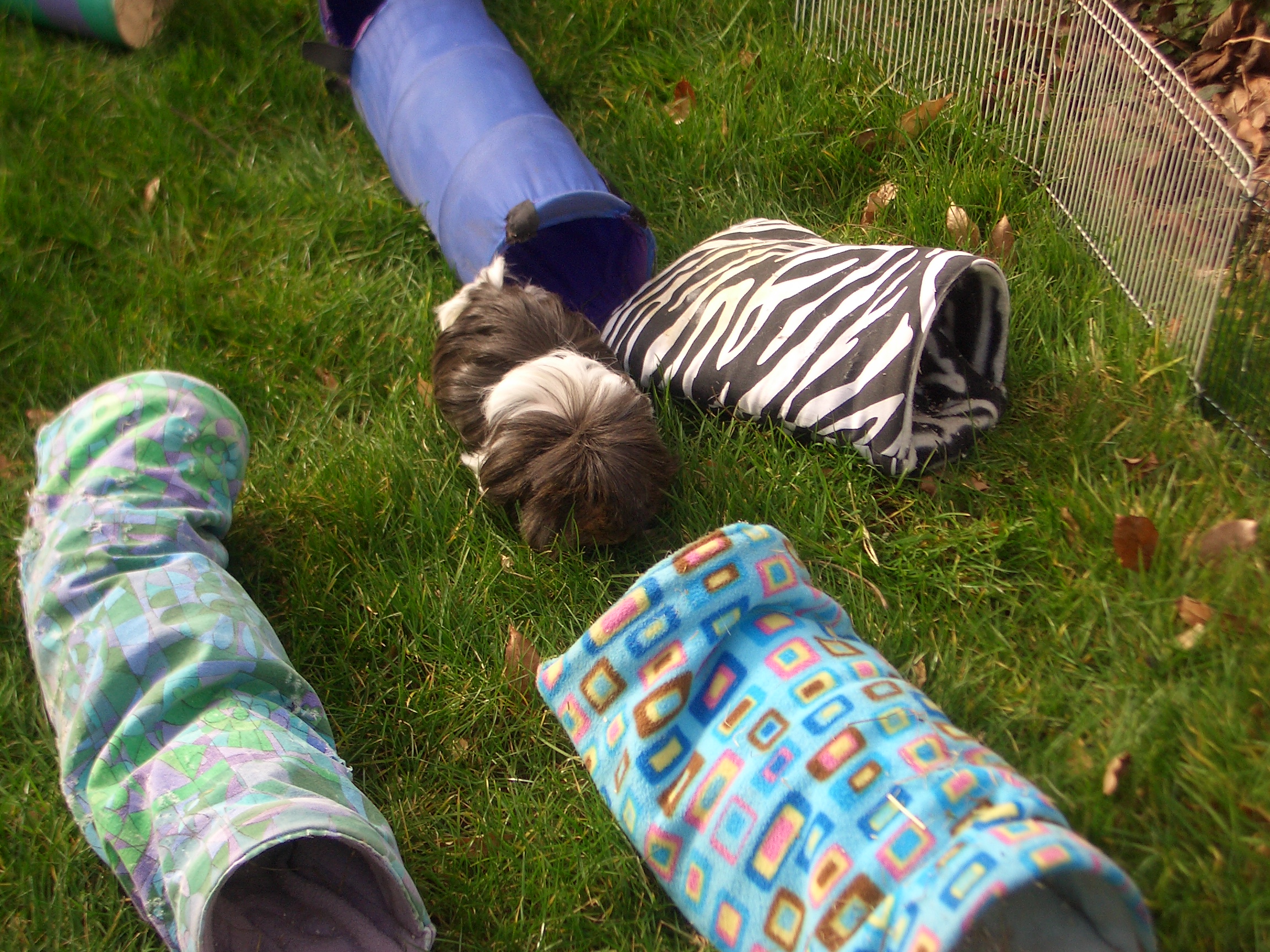 Last week we went out in the garden to do some lawn-mowing for the first time since last summer. It was cool on the feet but warm in the air, although Mummy put lots of our tunnels and hidey-holes around so we could sit inside them if we wanted. Sometimes we did, sometimes we didn’t.