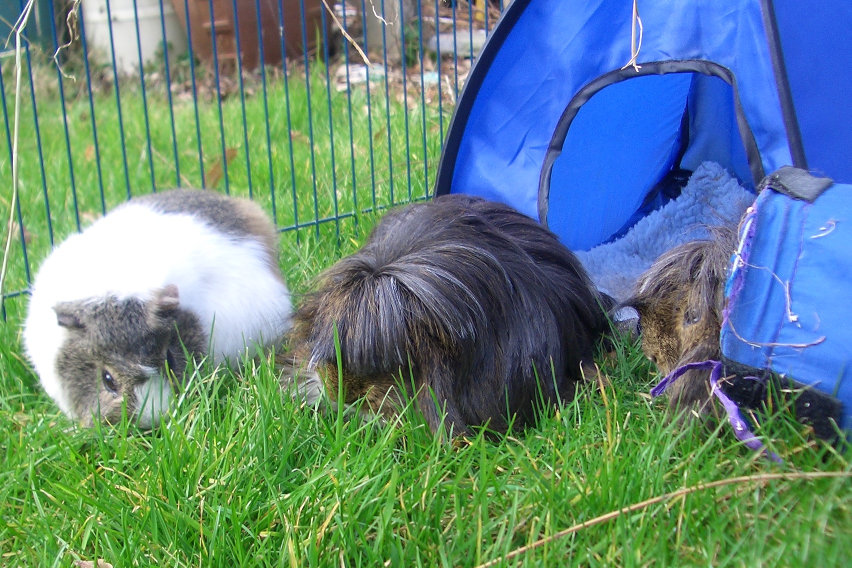 But the good thing is, this week she hasn’t had to wrap her arm up when she’s doing things, and she’s taken our cage tops out in the garden. So we’ve all been able to go out at the same time, and chat to each other through the bars. Hec noticed Mummy doing something very strange in the morning of days when we’ve gone out. She seems to be wiping the grass with our big red towel. It must be effective as it’s nice and dry when we go out about 2 pm, and the week before she said we couldn’t go out then as the grass was wet. Is she really drying the grass for us? I think she is. I know she doesn’t want me to catch cold.