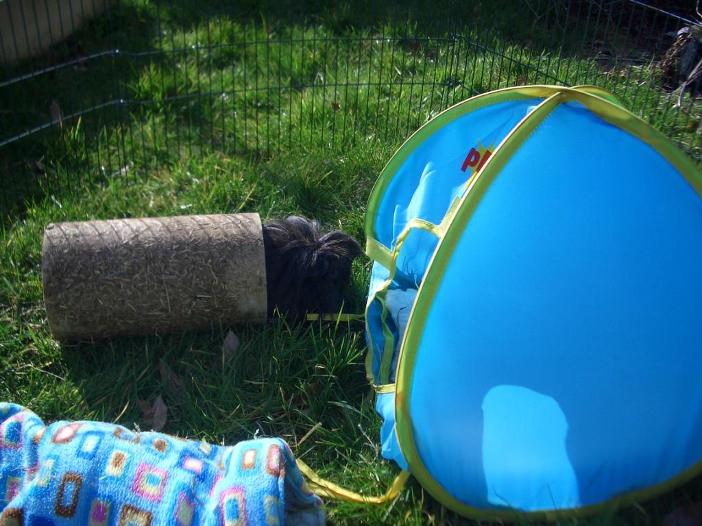 The sun was a bit bright but the ground was a bit cold, so it was hot and cold at the same time. The grass was nice, though, best eaten from the tunnel or the tent. I decided to brave the cold in the end. Mummy checked my feet when she put me back in my cage and somehow, they weren’t cold at all! Nobody else went out, just us. I think it’s because we’ve got thick hairy coats.