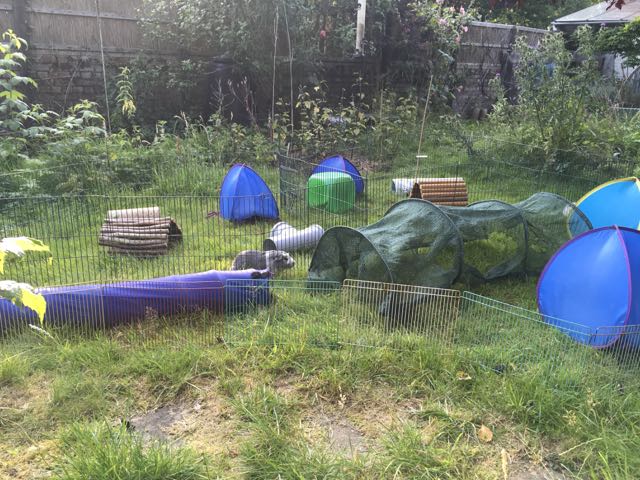 This summer, Bertie has been in his own run, Oscar has been in his, and Midge, Biggles and I have been in the other – usually a much bigger one. Mummy says it’s because we have three times as much grass to get through than the others. I know it’s also because she likes it when we all run around together and are sociable. I like being sociable too.