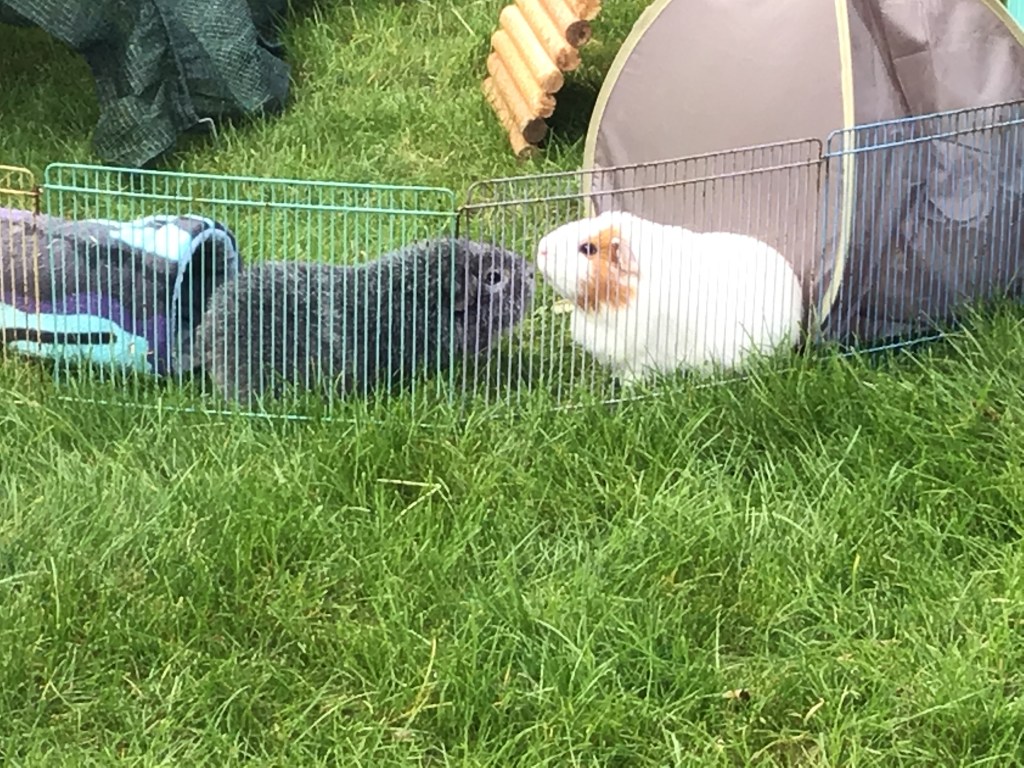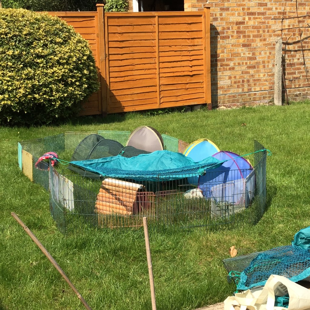Apparently it’s going to be cooler this week, with rain as well. So we won’t go out. We’ve done a pretty good job on the grass, even though I say it myself. The bit we had this weekend was really lush. Mummy put the shade tunnel over it to encourage us to eat it.