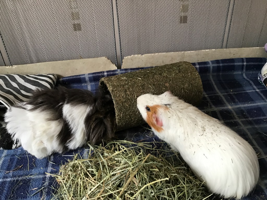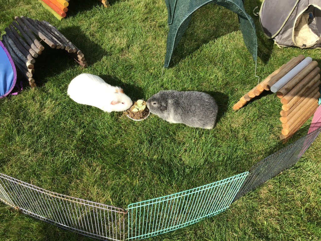 As you can tell, we had a good time. A grassy tunnel in the morning, to replace the one we’d eaten all the grass off long ago. Then in the afternoon, out in the not-too-hot sunshine, eating cake and wandering around the grass. The cake is made of mashed pellets, with added thyme and oregano, and decorated with cucumber pieces. It’s yummy!
