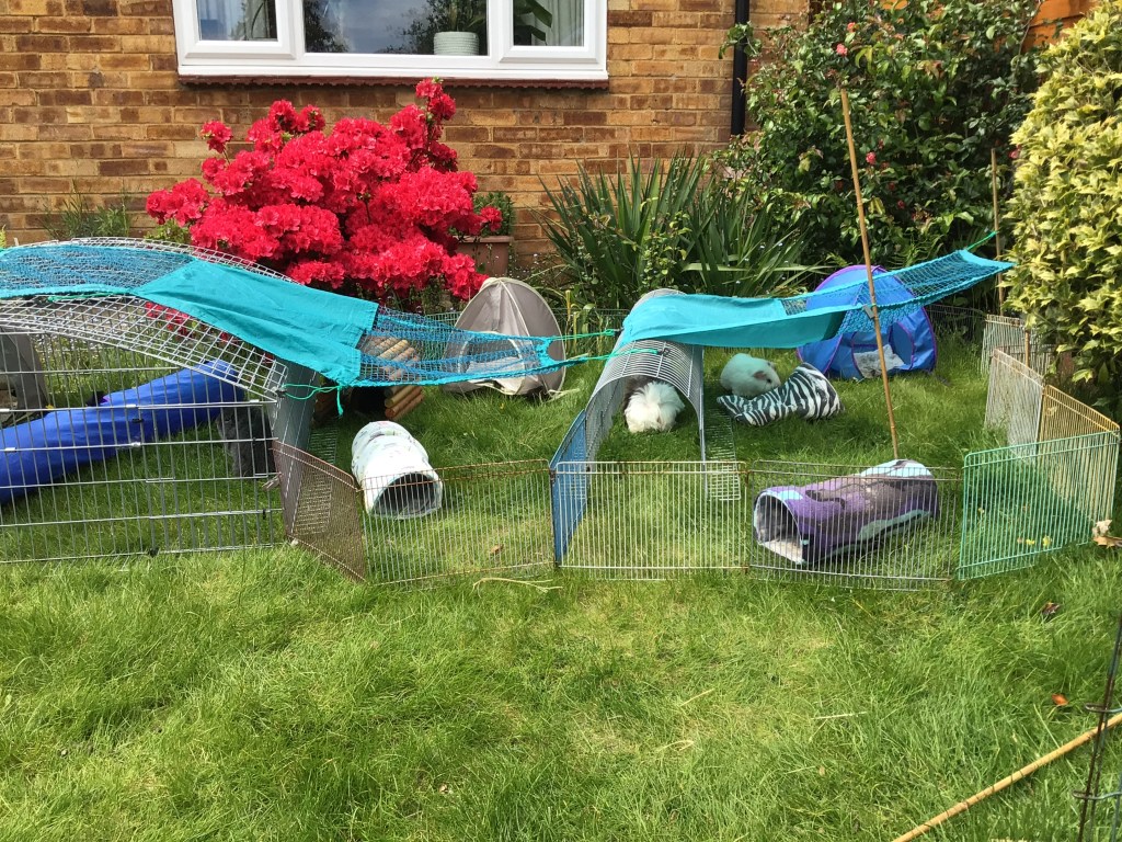 We’ve got three runs: Roscoe, Neville and I are in one, usually with the wire tunnel, which is fun. Locksley is in the big one with the strong cover, and Ludo is in the one in between us. He seems quite happy with the situation. Ludo and Locksley have hardly seen each other for months. Locksley goes back in his run before Ludo comes down into his pen after cuddle time (when we’re running on the floor). He has floor time after we go back. It’s all very complicated.