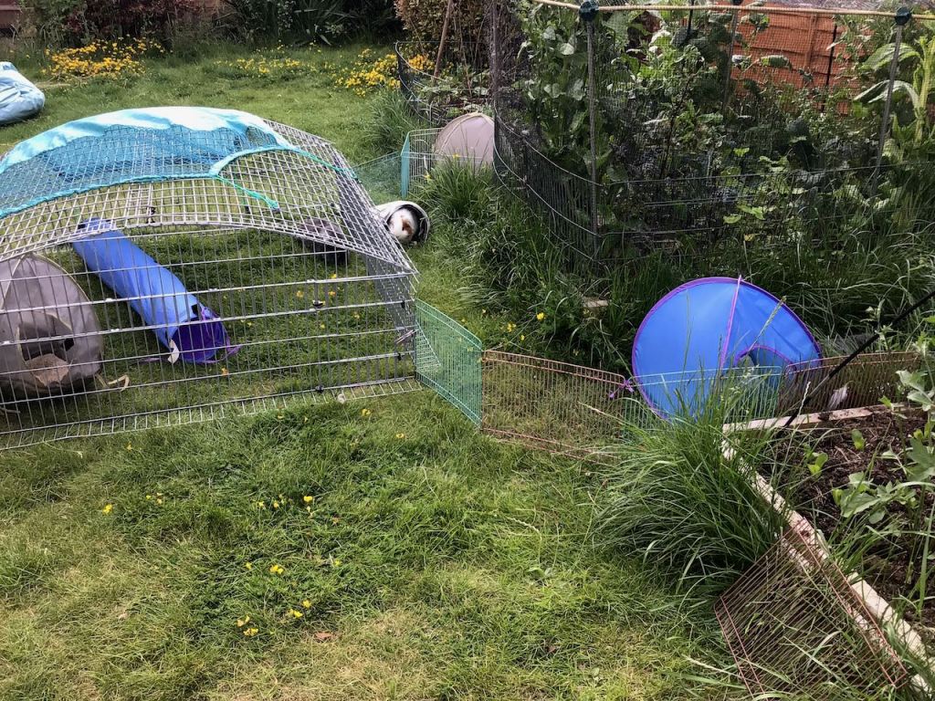 Roscoe’s been poorly since Monday evening. I don’t know whether it was retiring from blog, or maybe he was feeling funny when he decided to give it up. It was very hot in the garden, but we were in shade. Roscoe still went all wobbly. Mummy isn’t sure whether he had heat stroke or a different sort of stroke, but he’s been wobbling about all uncoordinated all week. Mummy’s been feeding him water and Emeraid (separately) and sometimes he’ll eat herbs and cucumber. When he’s in the run he’ll sit in one of his cosies most of the time, but he swaps over every now and then, checking in for some water, too. Mummy says she thinks he’s improved a bit this weekend, because he’s keener on food than he was. She was ever so worried about him early in the week. She even got up in the middle of the night to check on him. But yesterday he was out in the run drinking from his waterbottle which he hasn’t been doing, so that’s a good sign.