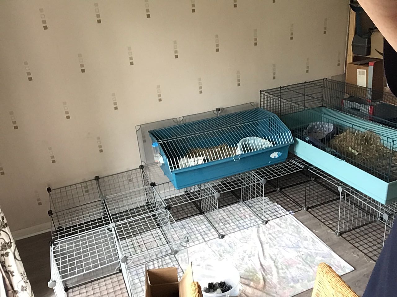 I have enough space to run around in my cage. It’s not really a cage, it’s more of a pen. It’s made from panels and it’s called a C&C. Apparently that stands for correx and cube. Correx is a sheet thing many floors and sides are made of, and cube is the type of panel. It’s in shops to make up into shelving units. But Mummy, and many, many other guinea pig people, make it up into runs.