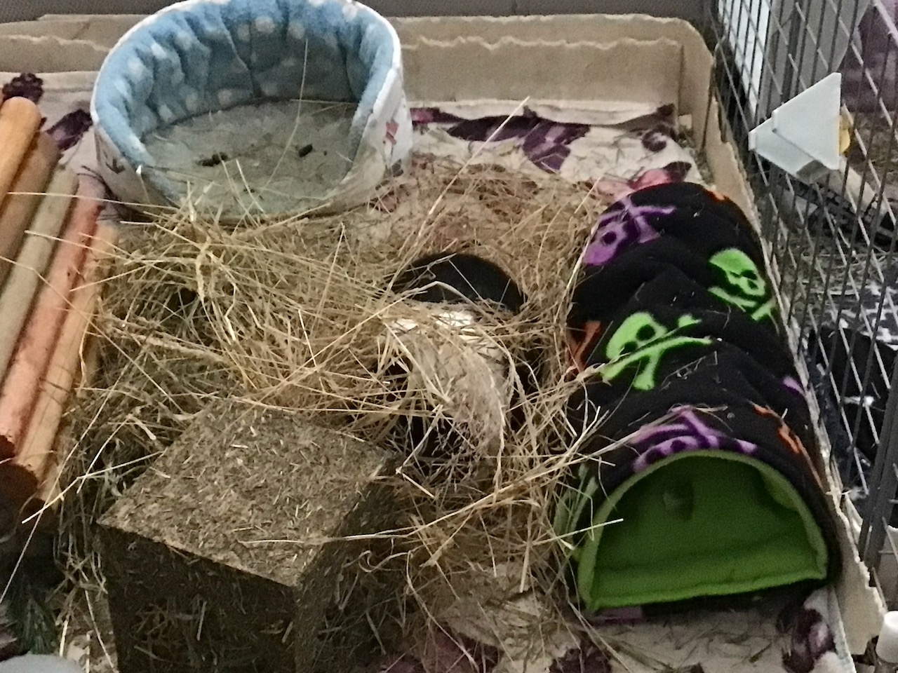 He gets all his hay in a big pile in the middle of his run. Whenever Mummy puts it in he pushes at the pile, and delves into the bottom of it, pushing his nose out the other end at the top. Mummy laughs at him.