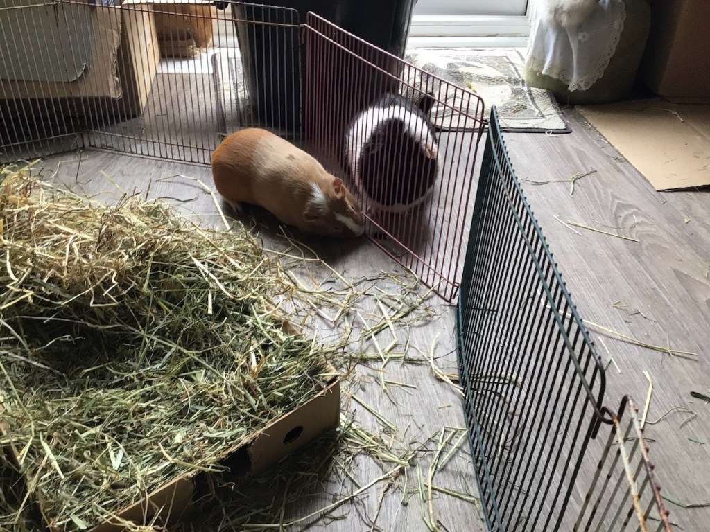 Yesterday Mummy put me in the run she sets up on the floor for them in the morning. Then she brought Victor back and put him in too. So we chatted for a bit, and then ignored each other when Mummy put some nice hay in. Then she brought Pippin back after his Cucumber & Cuddle time.