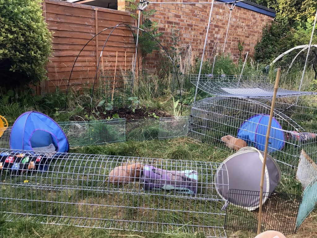 When I was pretty dry we went out in the garden. We go out once the temperature outside is not much more than the temperature inside. Most days that’s been about eight o’clock. Yesterday it was cooler, and we could have gone out at three, but Mummy went outside to check and discovered it was raining a bit. She’s been giving the vegetable beds rain in the evening, after we’ve gone in. You can see from the picture she’s planted the cucumbers around a green net, and there are lettuces all around them. The trouble is the blackbirds keep digging in the nice soil hoping to find more worms. Mummy ran out of mealworms for them because they eat so many.