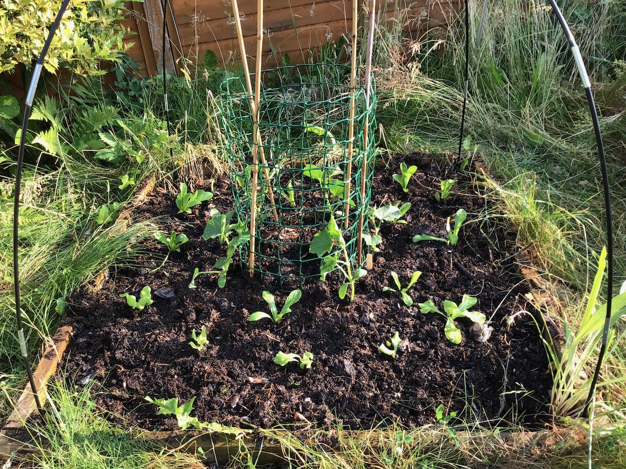 When I was pretty dry we went out in the garden. We go out once the temperature outside is not much more than the temperature inside. Most days that’s been about eight o’clock. Yesterday it was cooler, and we could have gone out at three, but Mummy went outside to check and discovered it was raining a bit. She’s been giving the vegetable beds rain in the evening, after we’ve gone in. You can see from the picture she’s planted the cucumbers around a green net, and there are lettuces all around them. The trouble is the blackbirds keep digging in the nice soil hoping to find more worms. Mummy ran out of mealworms for them because they eat so many.