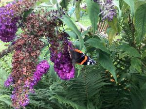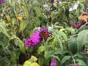 There were lots and lots of butterflies out when it was sunny. Mummy counted 24 butterflies on our buddliea outside our window. Mainly Peacocks and Red Admirals, but also Large and Small Whites, Painted Ladies, Brimstones, and yesterday for the first time this year, a Comma. And there are Holly Blues and Gatekeepers in other parts of the garden. Sometimes they sit on other things to sun themselves. Mummy’s leg, for one. And there’s a picture of one on Neville’s fiddlesticks. They haven’t come and rested on me yet. Maybe I should stay still longer.