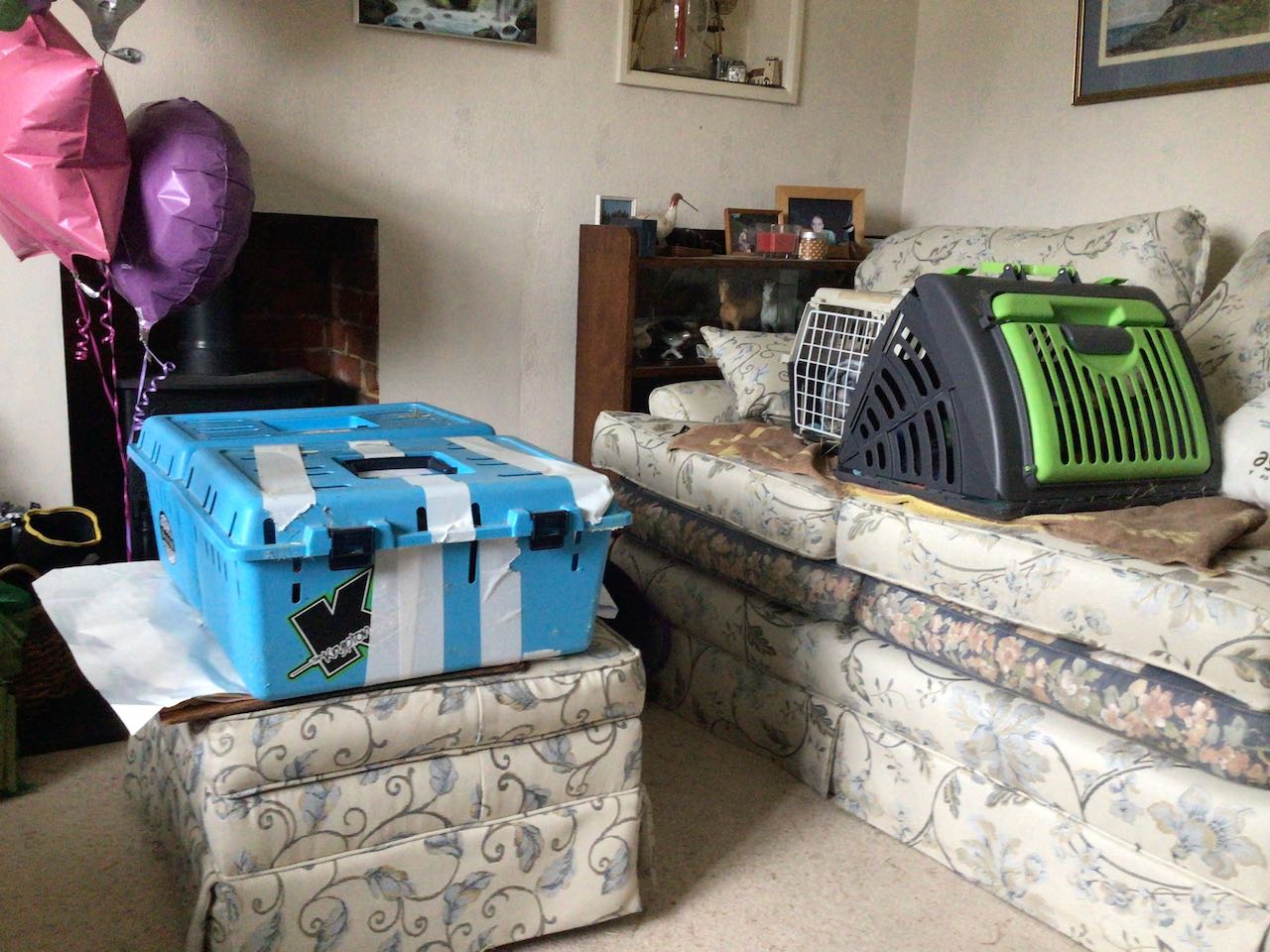 It was pretty dull all day, but the people still put it up and made it work for us. Mummy put us in our boxes in the front room while they were drilling our wall. It didnt take them long, but six drillings, repeated a little while later, was quite enough for us. It would have been horrid if we’d stayed in our runs. The drilling is to hold the awning’s house up. You can’t see the awning when it’s inside.
