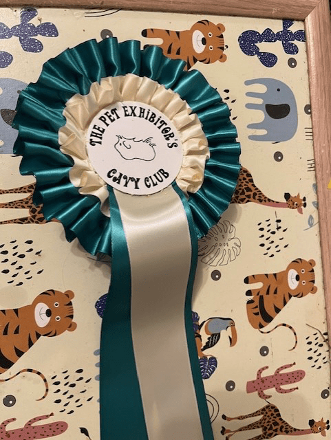 I had a lovely sleep and Mummy came back the next day to refresh my food. I was being judged today so she got me out of my pen and checked that I was nice and clean and I also got some more vegetables too. Well then I didn’t see my parents again until quite a bit later in the day, they spent the day looking at the stands and giving out prize cards, there were a lot of these, so imagine my surprise when some appeared on the front of my pen! When my Parents came back they seemed very happy with the cards I had. They gave me some more food and left for the night, I set about the big pile of veggies they left and had another lovely sleep.