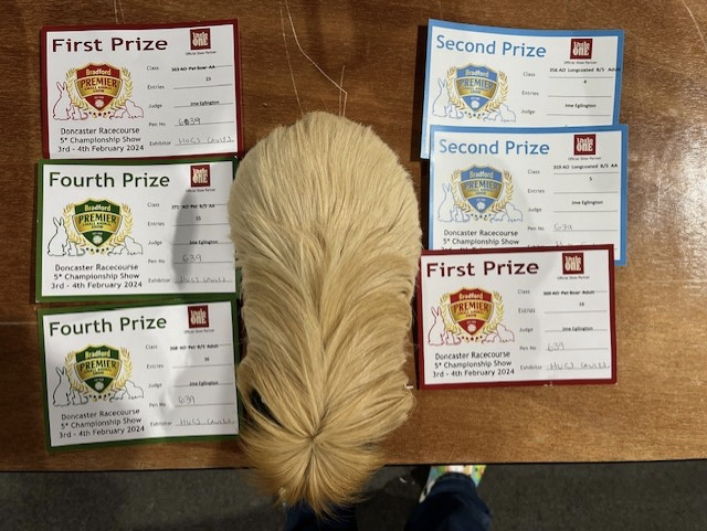 I had a lovely sleep and Mummy came back the next day to refresh my food. I was being judged today so she got me out of my pen and checked that I was nice and clean and I also got some more vegetables too. Well then I didn’t see my parents again until quite a bit later in the day, they spent the day looking at the stands and giving out prize cards, there were a lot of these, so imagine my surprise when some appeared on the front of my pen! When my Parents came back they seemed very happy with the cards I had. They gave me some more food and left for the night, I set about the big pile of veggies they left and had another lovely sleep.