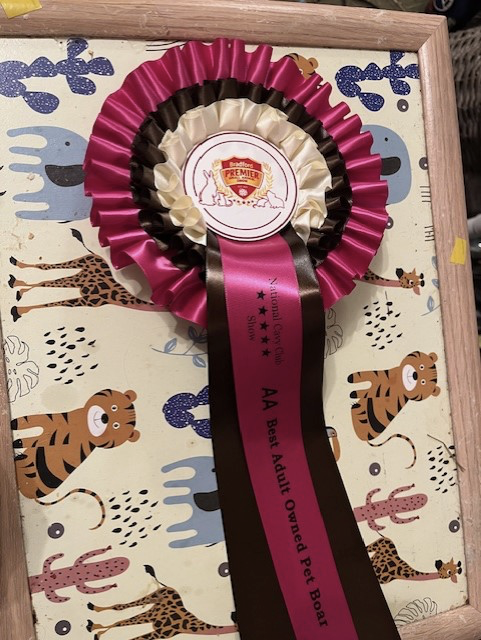Then the next morning more cards had appeared. When my Parents came to feed me and check I was clean (for the 2nd show) they were very pleased and took a photo of me. Then, I didn’t see them again for a while as Mummy Doris was writing a judging book for Aunty Janet and Daddy Bob was writing cards for the Rare people show. While they were away some pretty things (read rosettes) appeared on my cage. My Parents were very pleased as I had won Best Boar on the Saturday, and then later on I got a pretty thing for the show on the Sunday. Then there was a presentation of all the shiny things (we didn’t get any of those), then we got put back in our travel crates for the drive home. It was a bit longer than the journey up because Daddy Bob needed more bean related refreshment, and we had to make a detour to drop a piggie off to Mummy Doris’s friend.