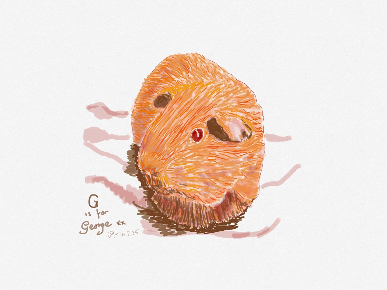 Mummy’s been drawing pictures every day this month. So far she’s done two guinea pig pics. She says she cheats and copies photographs. She did one of me for ‘Red’, and one of George for things beginning with G. I think she’s missed George’s whiskers.