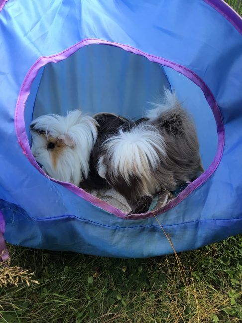 But they’ve learnt “up, up” when Mummy picks them up, and also to get into blue tent to come in from run time, so I suppose they are getting used to us. Ronnie makes a very high pitched squeak sometimes. I think he’s frustrated that Reggie’s in the tunnel where he wants to sit. But they’ve got two cosy tunnels, so what’s the problem?