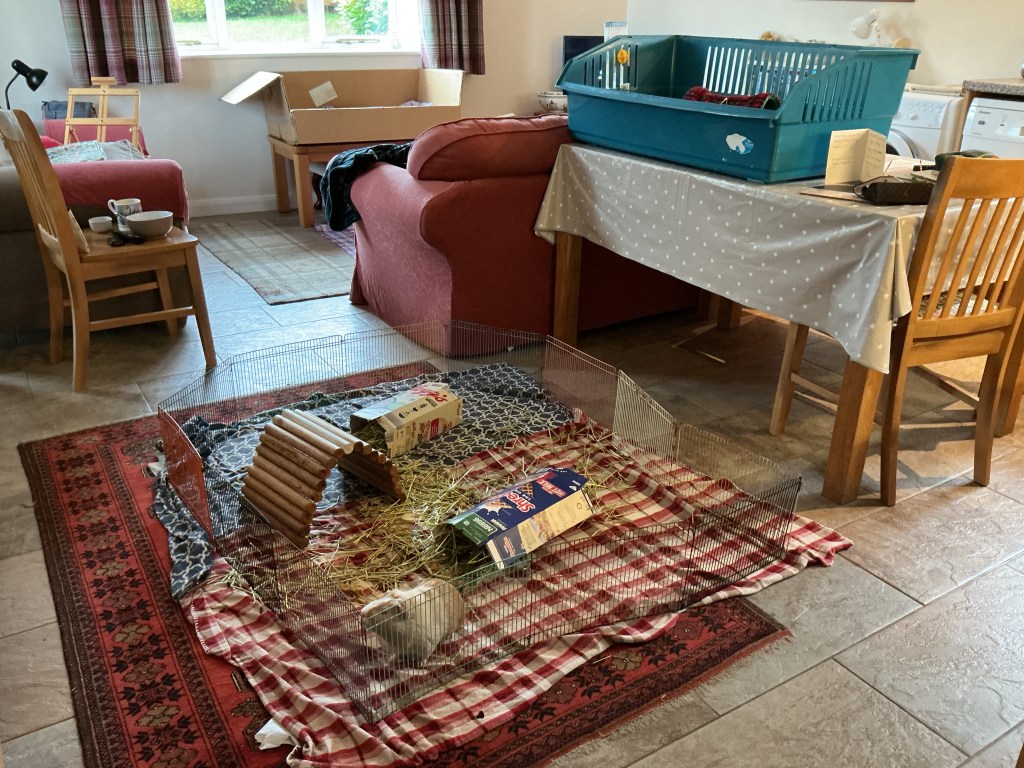 I’m in the blue cage and Ronnie and Reggie are in its box. It’s okay, we have our waterproof thing under our fleeces, and they are fine for a few days. I wouldn’t like to live in it all the time though. We also have a nice run on the floor. That’s got waterproof stuff under the fleeces too, and my fence panels from the garden. We have our morning runs in that. And afternoon runs too. Yesterday we had evening runs as well.