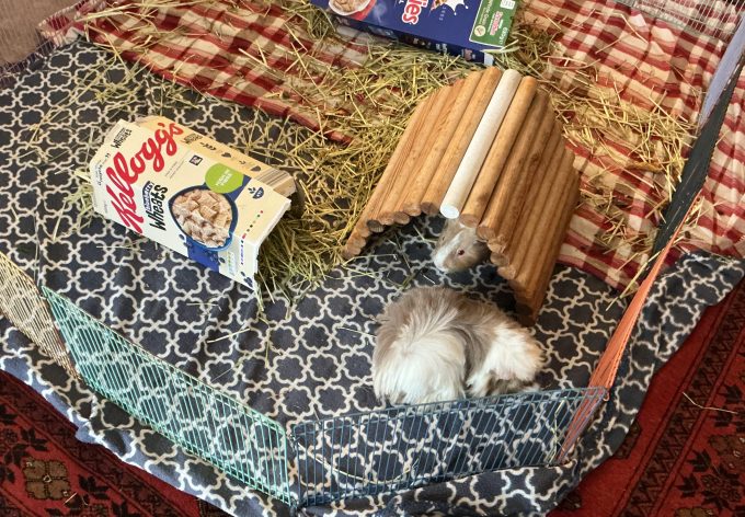I’m in the blue cage and Ronnie and Reggie are in its box. It’s okay, we have our waterproof thing under our fleeces, and they are fine for a few days. I wouldn’t like to live in it all the time though. We also have a nice run on the floor. That’s got waterproof stuff under the fleeces too, and my fence panels from the garden. We have our morning runs in that. And afternoon runs too. Yesterday we had evening runs as well.